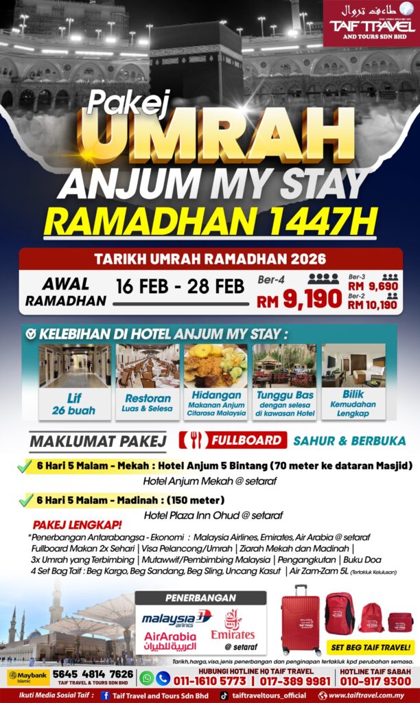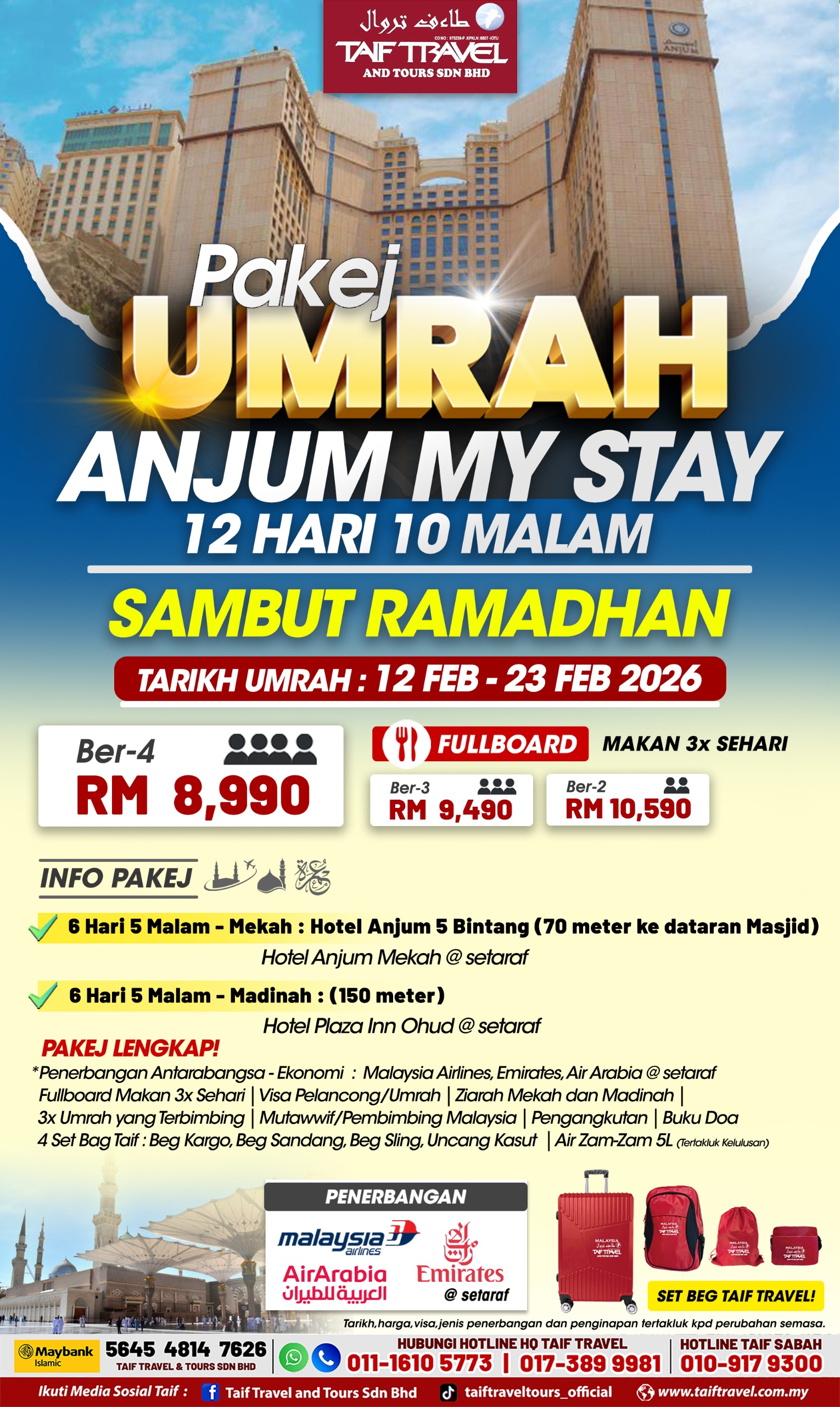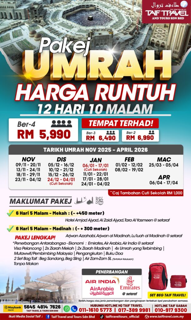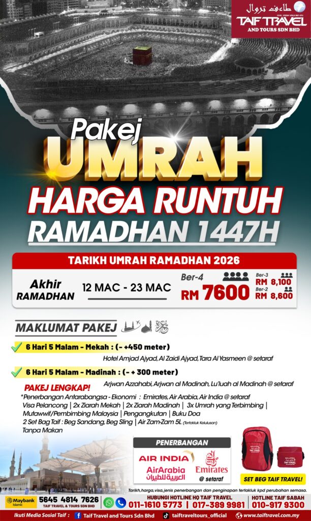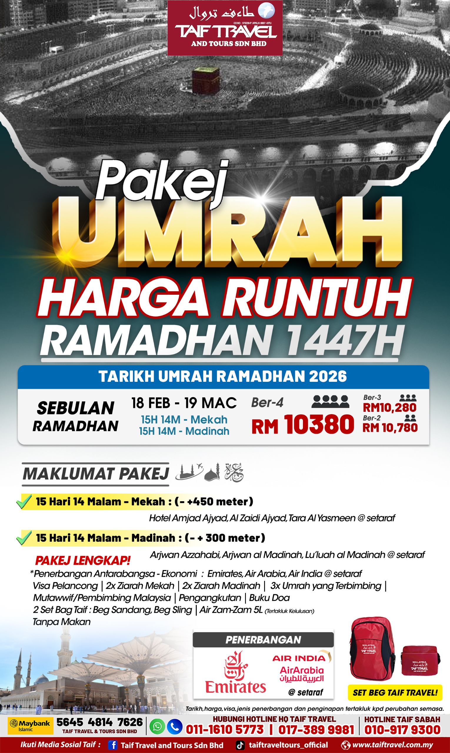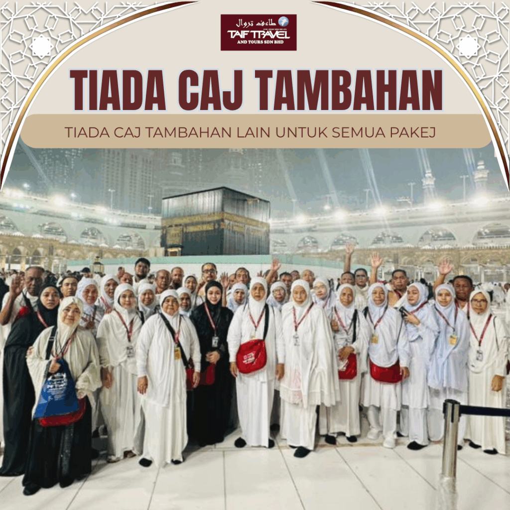 Kami menawarkan pakej Umrah pada harga yang amat berpatutan, tanpa mengorbankan kualiti perkhidmatan. Dari penginapan yang selesa, bimbingan ibadah menyeluruh, hingga ke urusan perjalanan yang tersusun semuanya dirancang dengan teliti agar anda dapat beribadah dengan kusyuk.