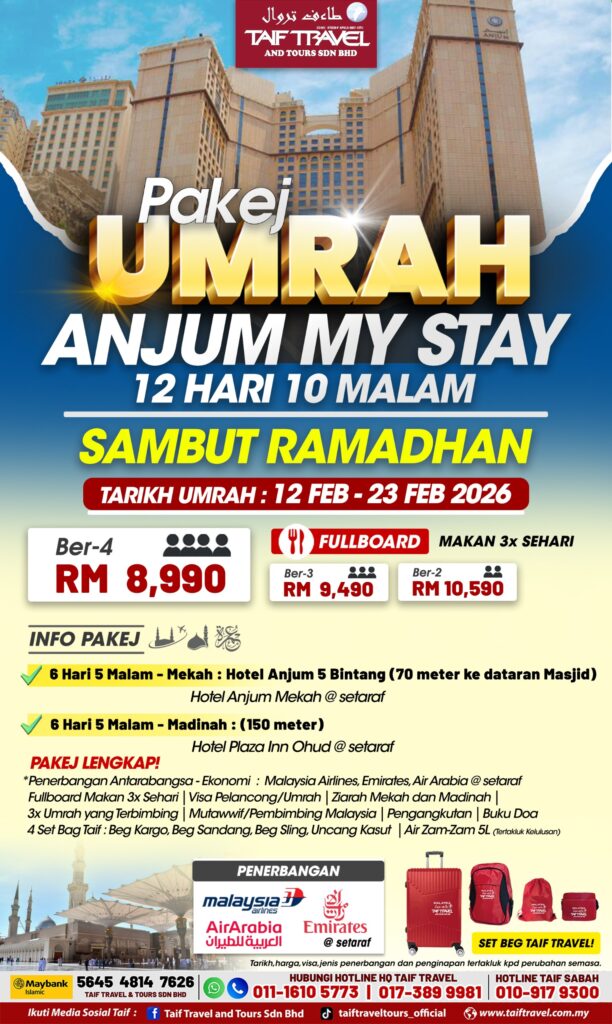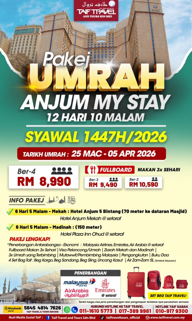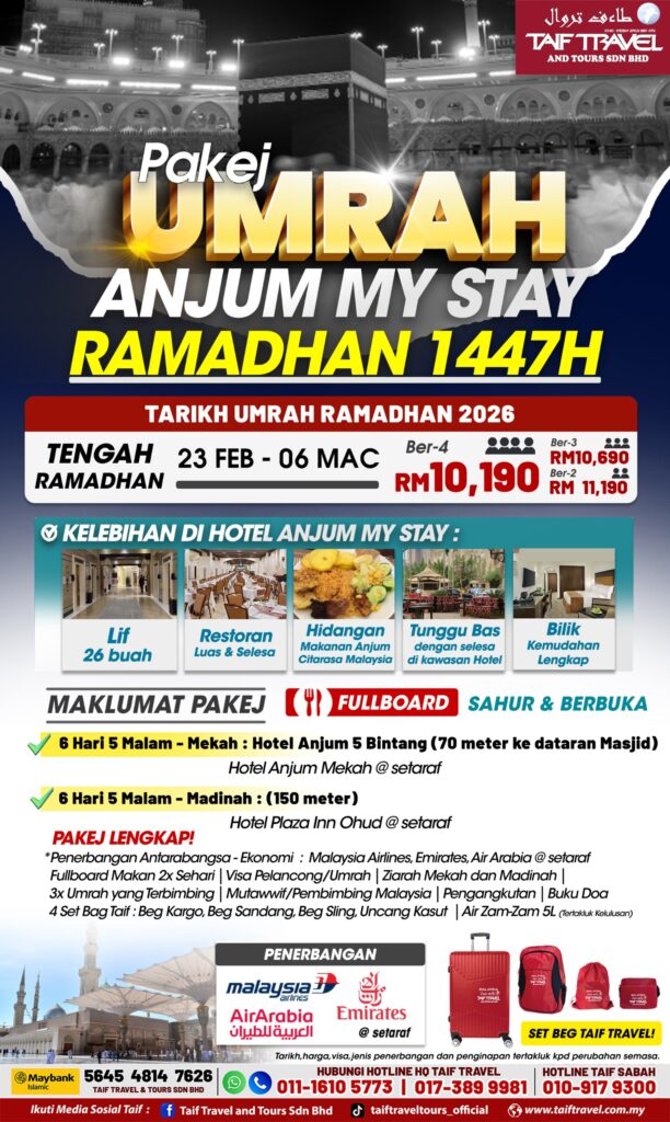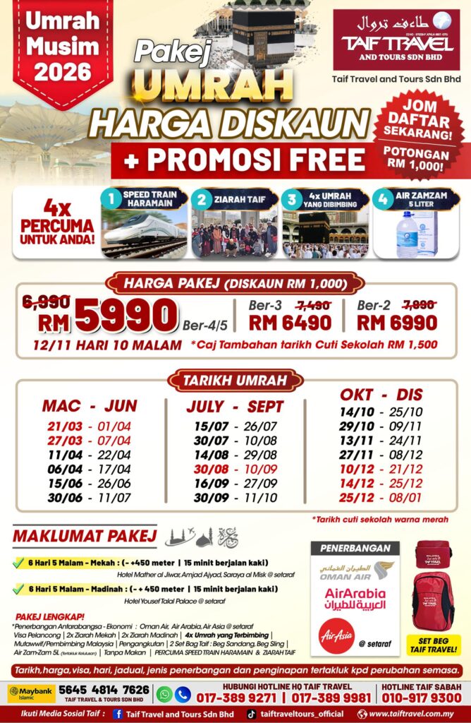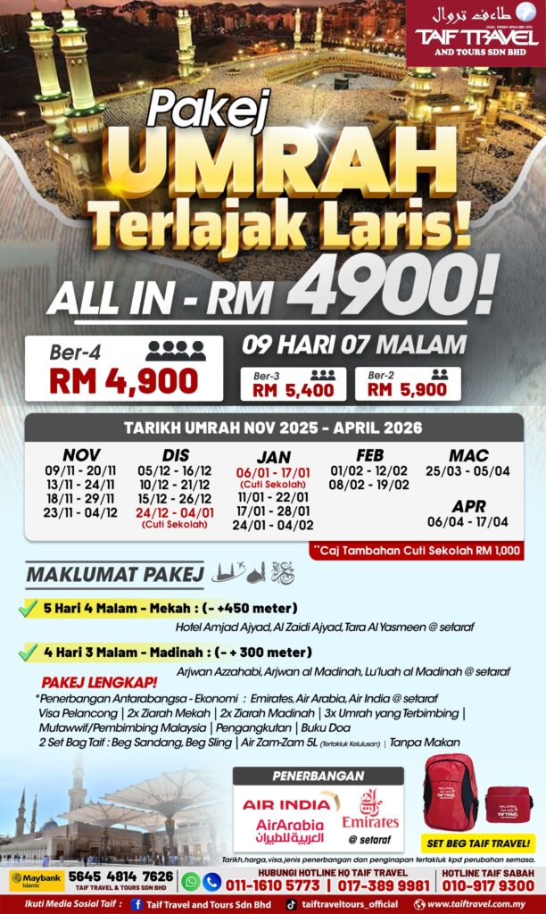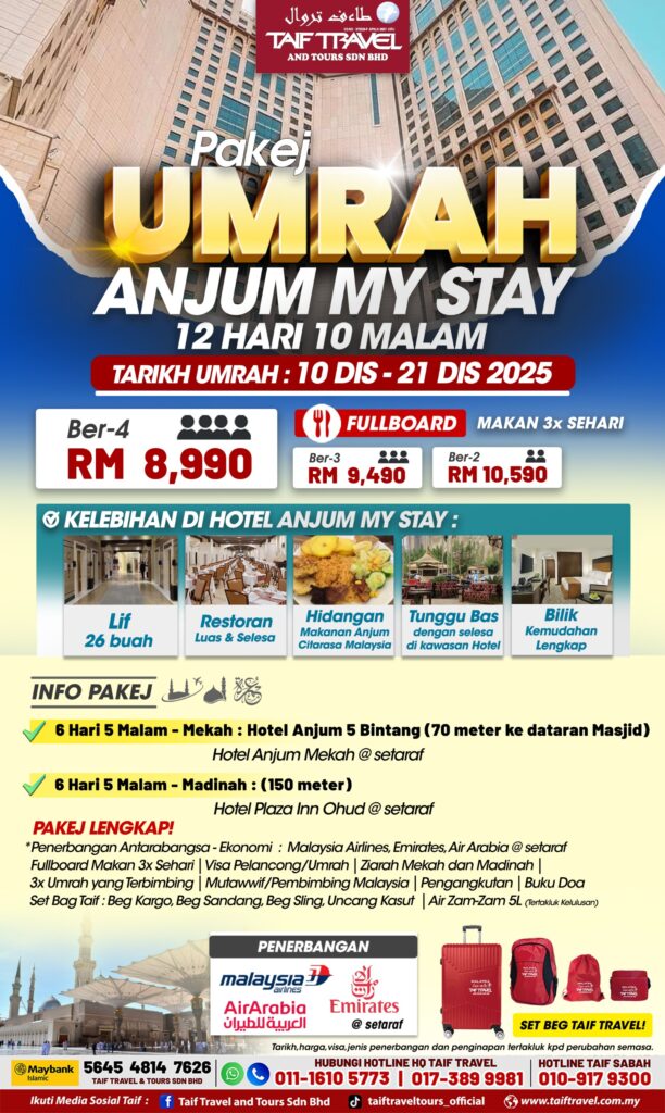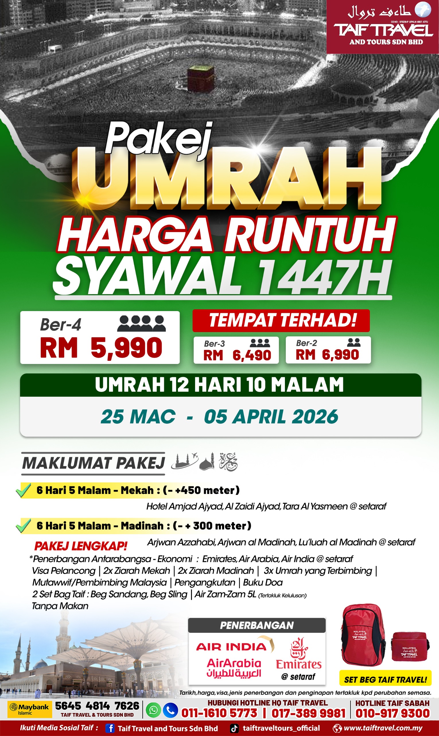 Kami menawarkan pakej Umrah pada harga yang amat berpatutan, tanpa mengorbankan kualiti perkhidmatan. Dari penginapan yang selesa, bimbingan ibadah menyeluruh, hingga ke urusan perjalanan yang tersusun semuanya dirancang dengan teliti agar anda dapat beribadah dengan kusyuk.